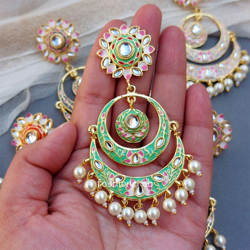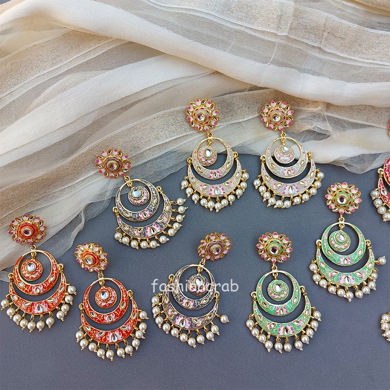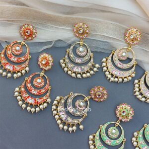 10 pair of assorted golden-toned Traditional Handmade Meenakari Earring for Women with hanging pearls.