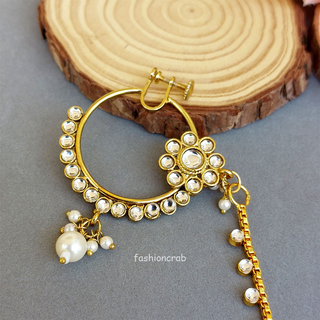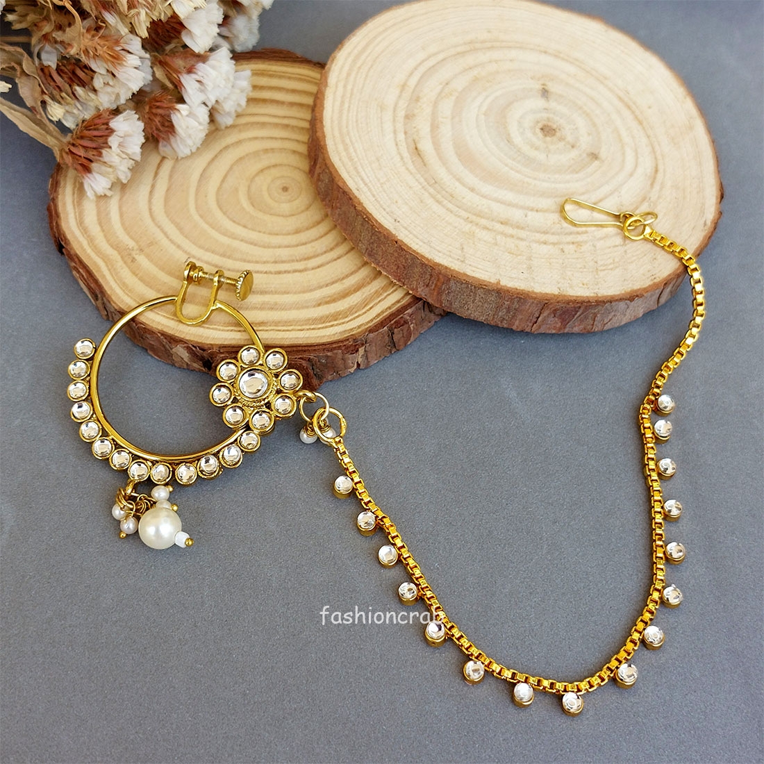 A pair of Bridal Nose Ring – White Nose Pin with Chain for Wedding.