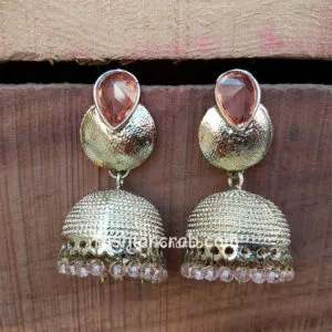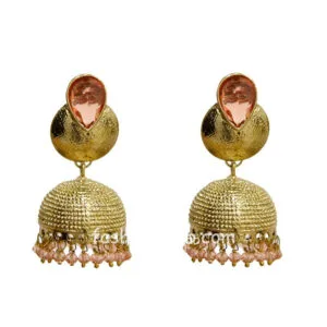 A pair of golden color women earrings has a teardrop-shaped base with a light pink stone encrusted, followed by a dome-shaped patterned drop, with beaded danglers. This Lightweight Golden Light Pink Color Jhumka Earring is very much in high trend gives you a real ethnic as well as royal look. This earring is designed for all age groups from college going girl to housewife. It is secured with a post-and-back closure.