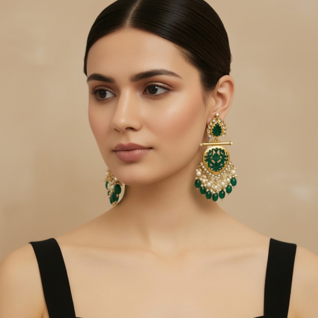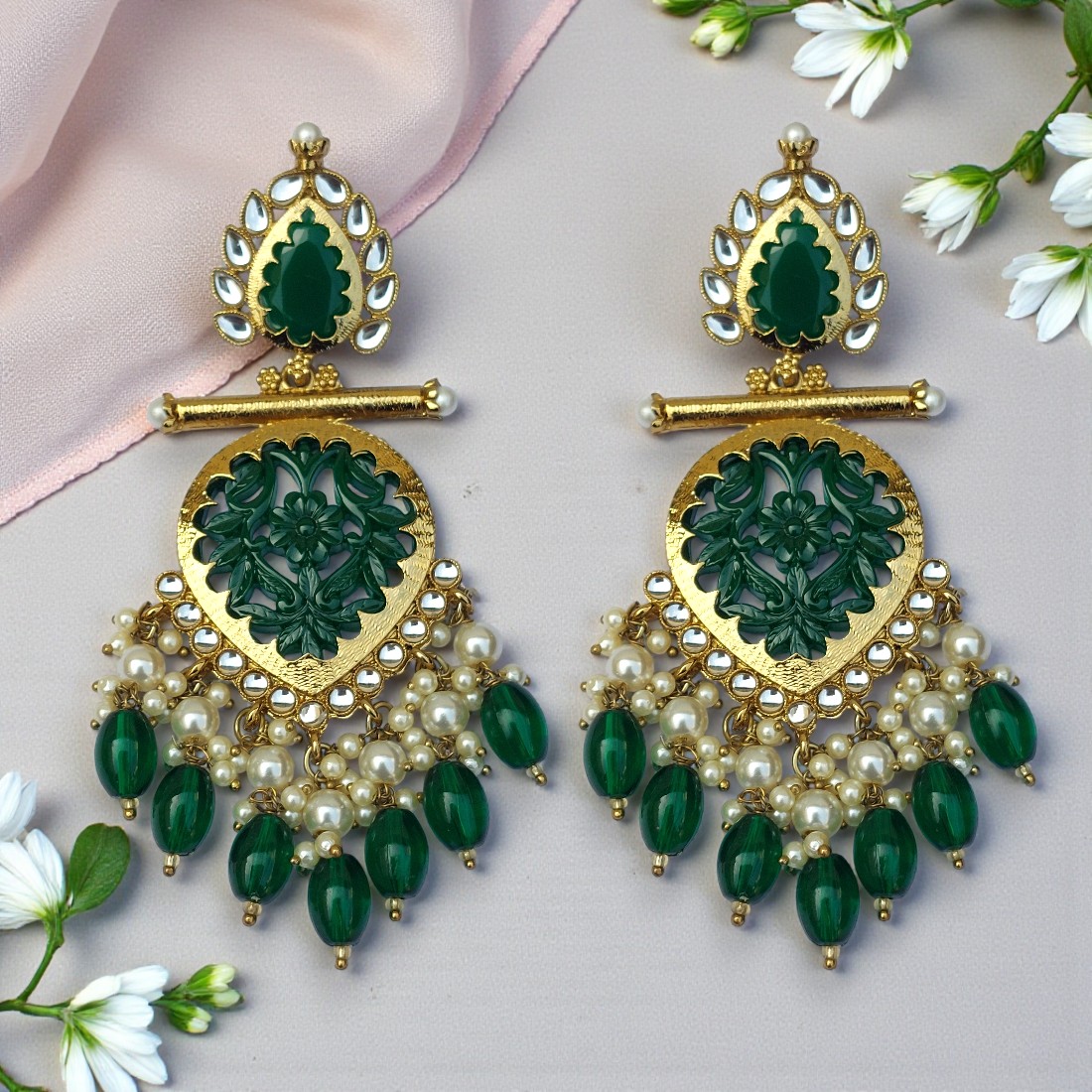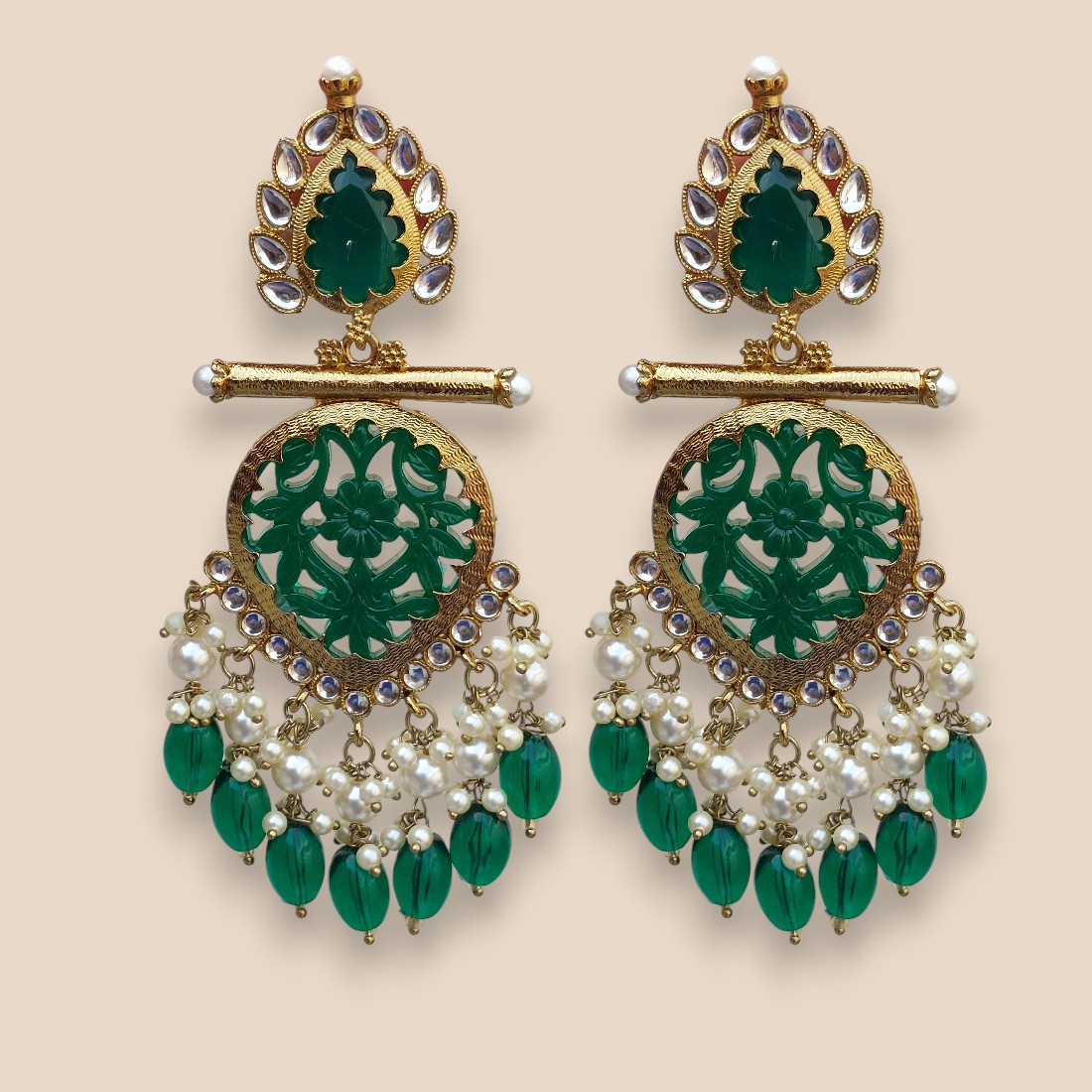 A pair of Golden-toned Green Earrings for Lehenga with carving stone.