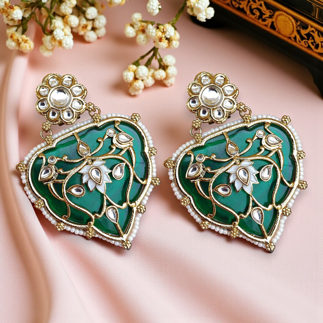 A pair of golden-toned Bollywood Jiyana Big Kundan Earrings Green for Co-ord Set.