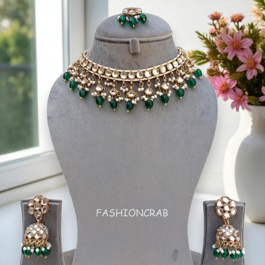 A pair of Traditional Green Katrina Kundan Jewellery Set for a Saree.
