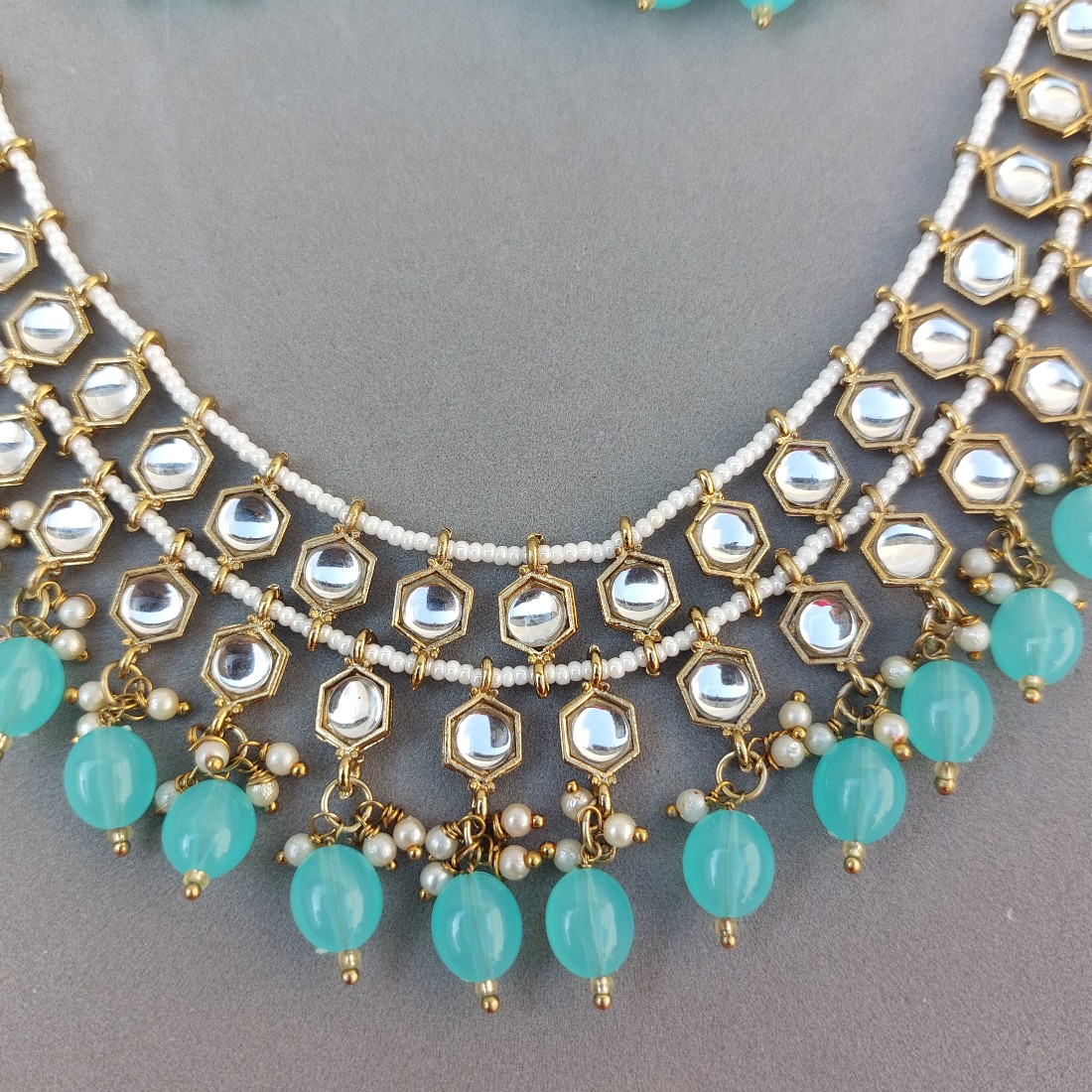 A pair of Traditional Light Blue Kundan Set with Earrings.