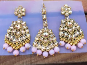 This Lightweight Maang Tikka with Earrings for Pink Saree is very much in high trend gives you a real ethnic as well as royal look. Gold-toned Kundan drop earrings have a floral base with stone-studded detail. This earring is designed for all age groups from college going girl to housewife. This is a handcrafted earring set with good quality polki and Pearl drops. For more, check out our latest fashion and Kundan women earrings and necklace set.