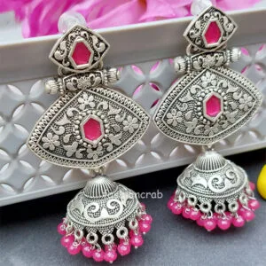 A pair of Pink Stone Silver Look Alike Jhumka for Saree.