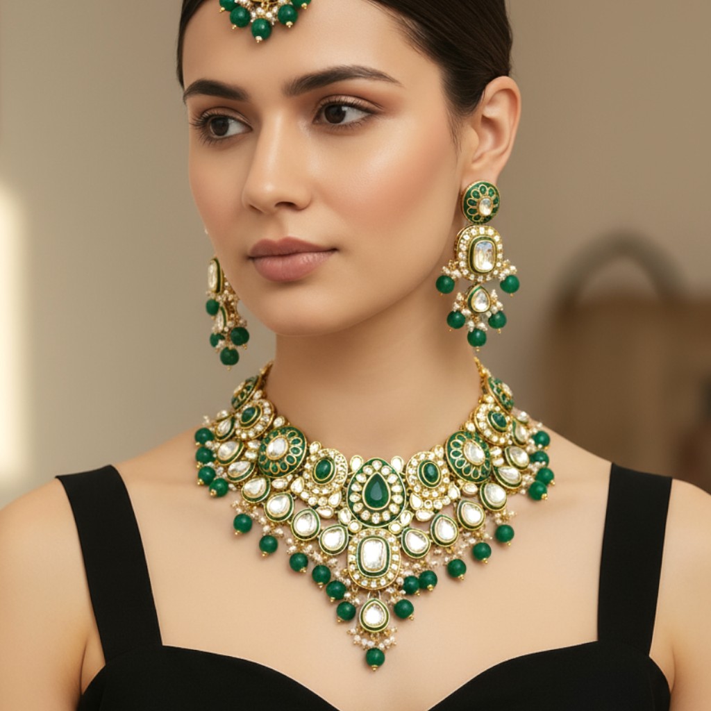 A pair of Traditional Radhika Green Kundan Choker for Bride.