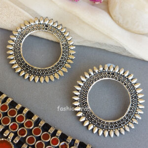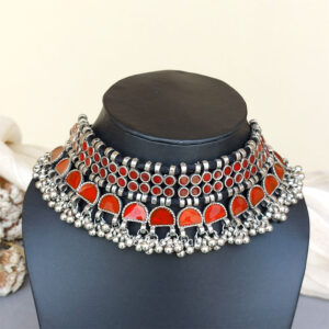 This Lightweight Red Choker Necklace with Earrings for a Saree for Navratri Garba is very much in high trend giving you a really graceful as well as traditional look. You can wear this choker necklace set on every occasion like a navratri, garba, outing with friends, college, or even office. Team this stunning oxidized necklace with your jeans and denim shirt, short black skirt, or even Indian Kurti. It is made of a premium quality oxidized silver material that makes it skin-friendly and rust-resistant. This necklace set is nickel-free and Lead-free as per International Standards. Chic, Boho style, statement fashion necklace for women.