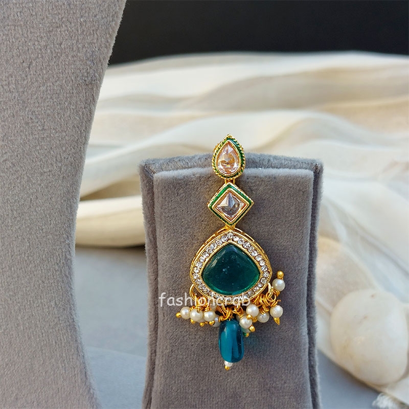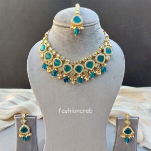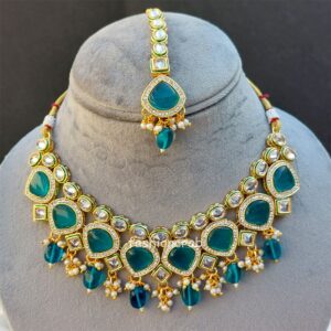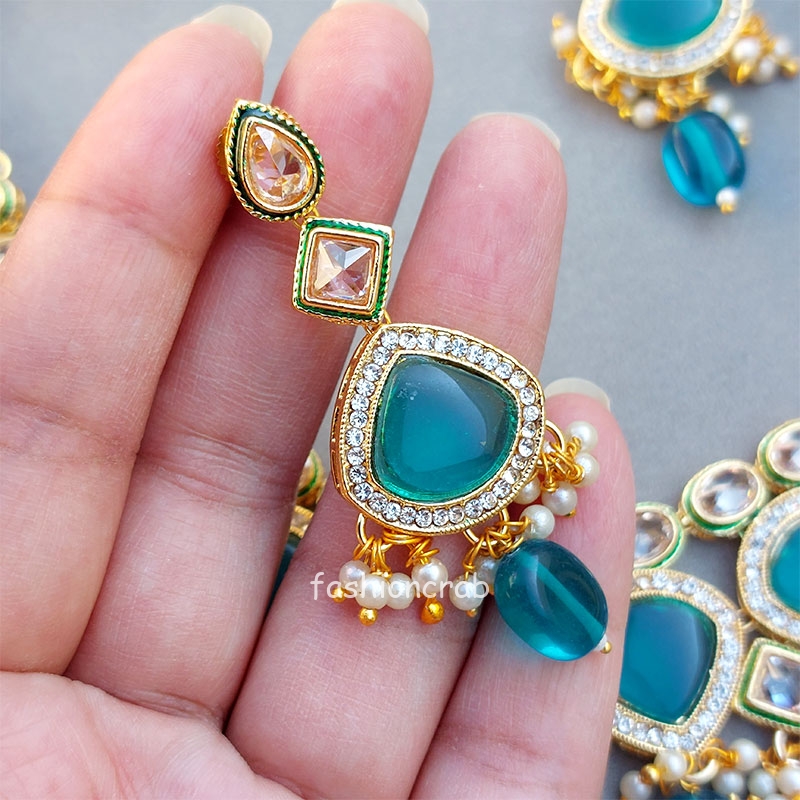 A pair of Traditional Simran Polki Necklace – Peacock Blue for Wedding.
