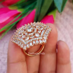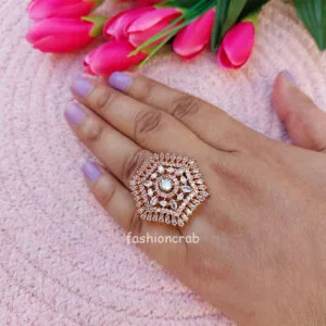 Accessorise your ethnic look by wearing this Sparkling Cubic Zirconia Rose Gold Adjustable Finger Ring from Fashioncrab to give a classy touch to your attire. Brass has been used in the making of this rose gold color beauty, which will sit pretty on your fingers and glisten away. Wear it with an Anarkali kurta, Salwar Suit, Saree and heels to match your elegant persona. This rose gold adjustable cz ring has a spiral golden detail with a cz stone-studded detail in the center enclosed with small floral stone which adds to the charm of this gorgeous ring. It can be worn for Engagement and Wedding Parties and can be used as a cocktail ring. One of the best gift for your loved ones. Keep away from Perfumes, Spray and Water. Nickel free and Lead-free as per International Standards that make it very skin friendly.