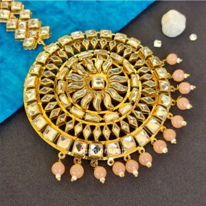 Look stunning in your evening wear with this Traditional Kundan Stone Punjabi Big Maang Tikka – Peach for Wedding / Women from Fashioncrab. This Wedding Maang Tikka is best suited for any forehead and can also be used as a Passa.